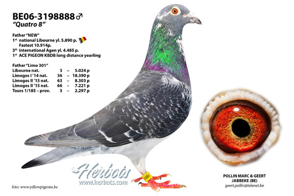 【新比利時驕傲】 (B14-3027025班公) 由馬克&吉爾特‧波林使翔,不僅榮獲:萊邦納國家賽一歲鴿5,890羽1名 (753公里) (10,910羽最高分速) – 阿讓國際賽4,485羽3名 (799公里) , 而且獲得2015年KBDB長距離一歲鴿鴿王全國1位! 很少見到這麼多優秀賽績、優秀品質集於一鴿!